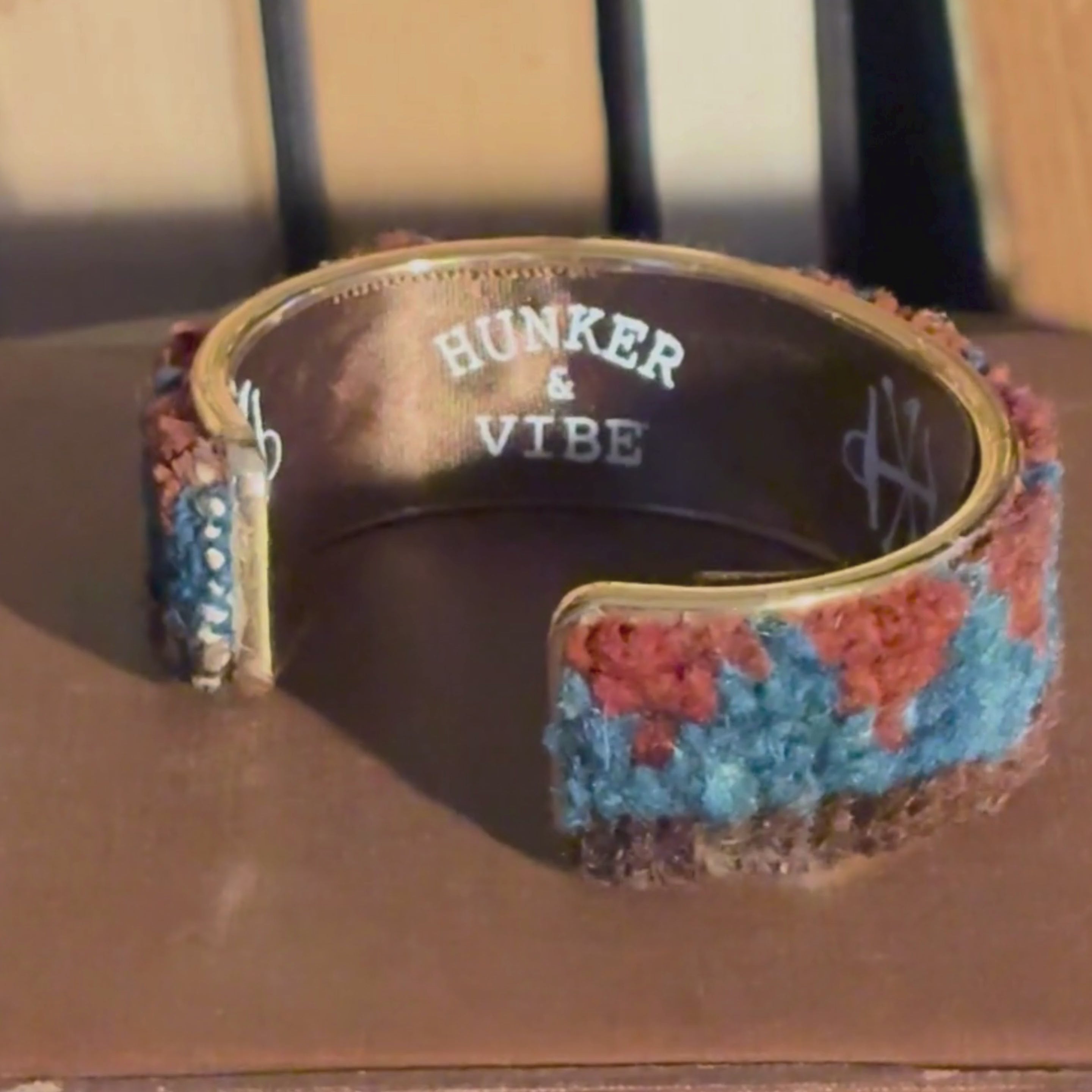 Discover refined elegance where discarded vintage materials are thoughtfully transformed into distinctive wristwear. This unique piece was crafted using a remnant of a heritage rug, rich with history and character.
