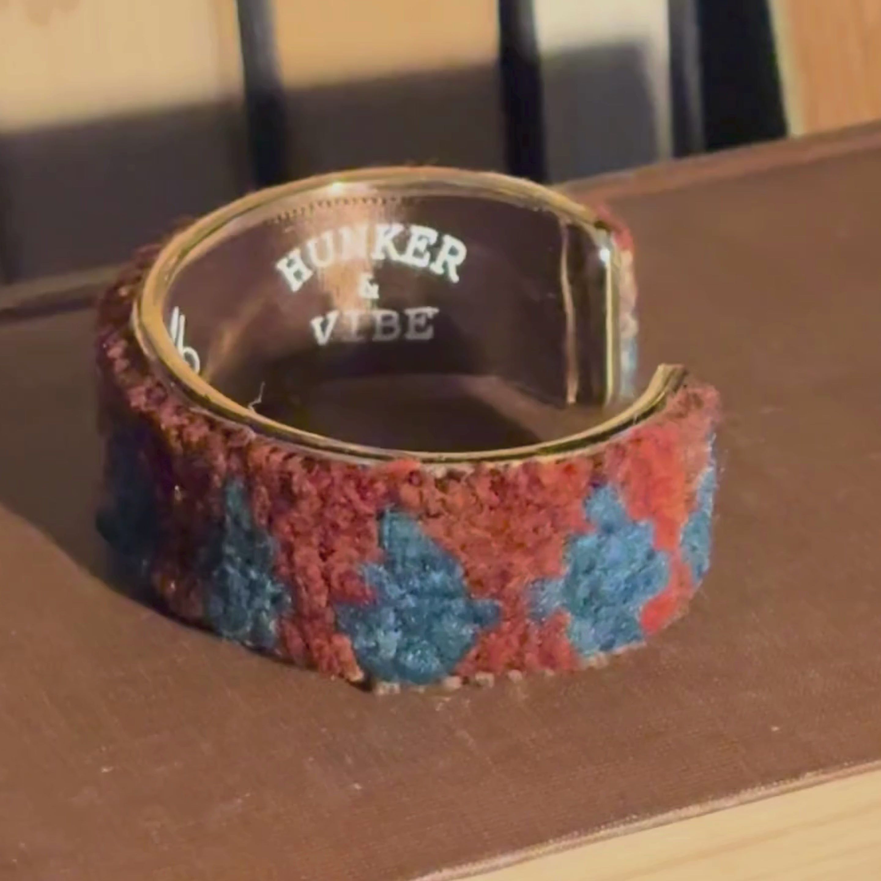Discover refined elegance where discarded vintage materials are thoughtfully transformed into distinctive wristwear. This unique piece was crafted using a remnant of a heritage rug, rich with history and character.